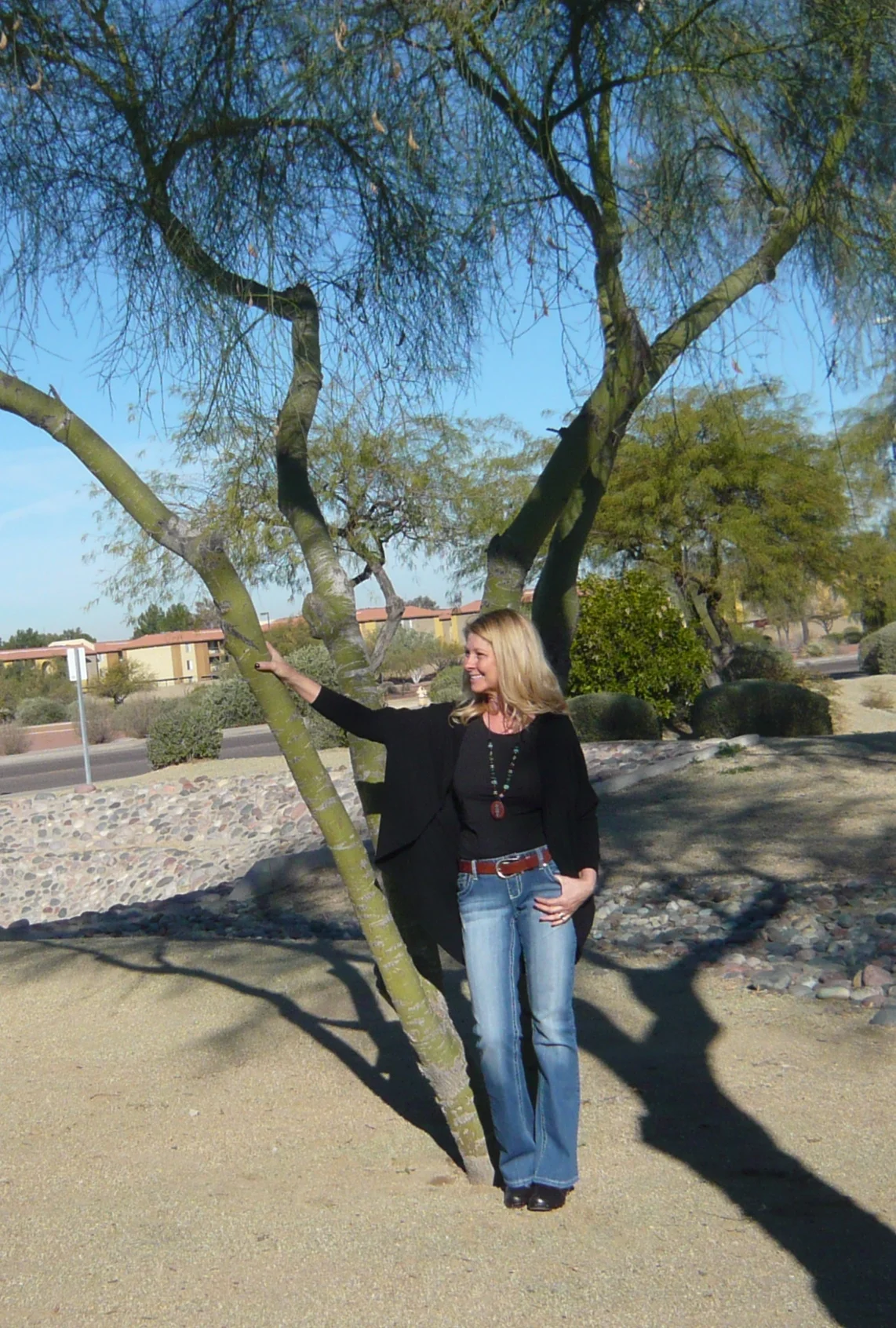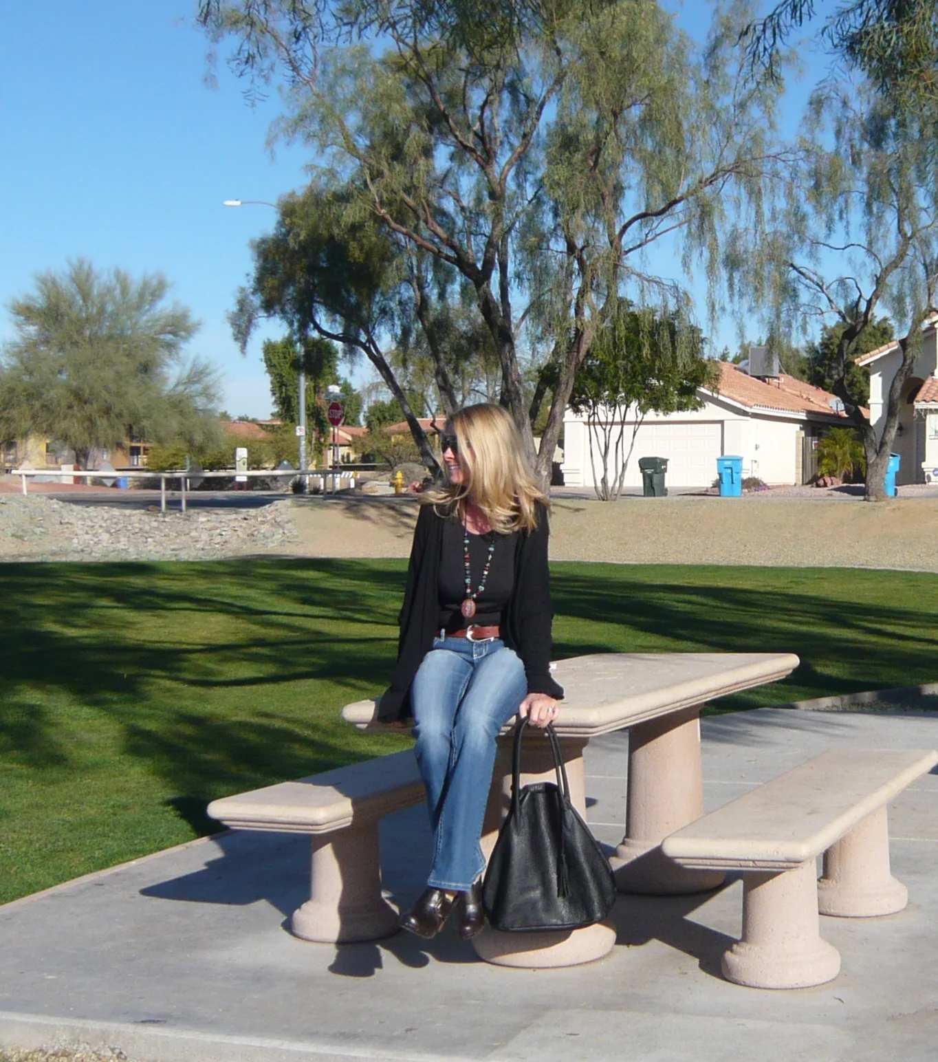 My husband made it to Arizona yesterday and now the whole family is together again. Today is going to be a very casual day so I dressed for the occasion. It is a lot of fun to wear light layers and peel them off as the day warms up. Today I am wearing a black tank top, black light weight cocoon sweater, jeans and mules on my feet. I think black is a good choice on a day when all you will be doing is walking around a lot. Tomorrow the whole family is getting together for a big hiking day and I am really excited. Nothing like hiking in the dead of winter in Phoenix!