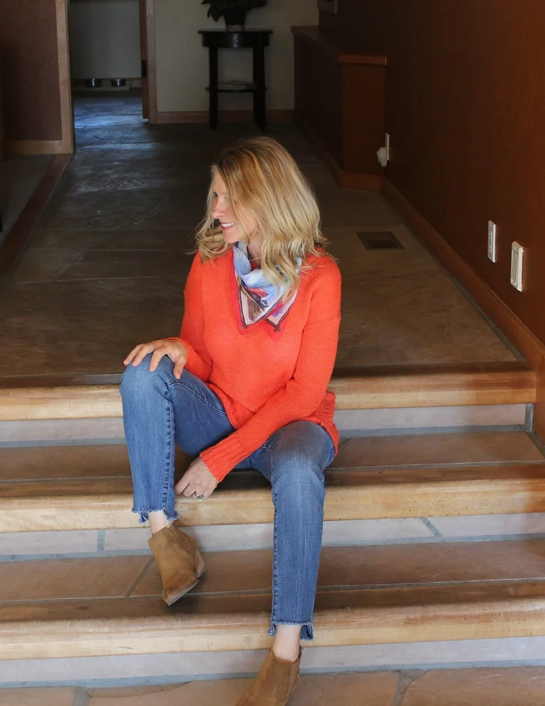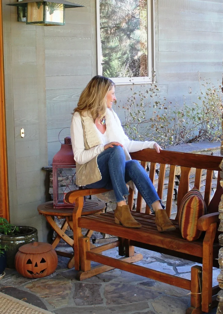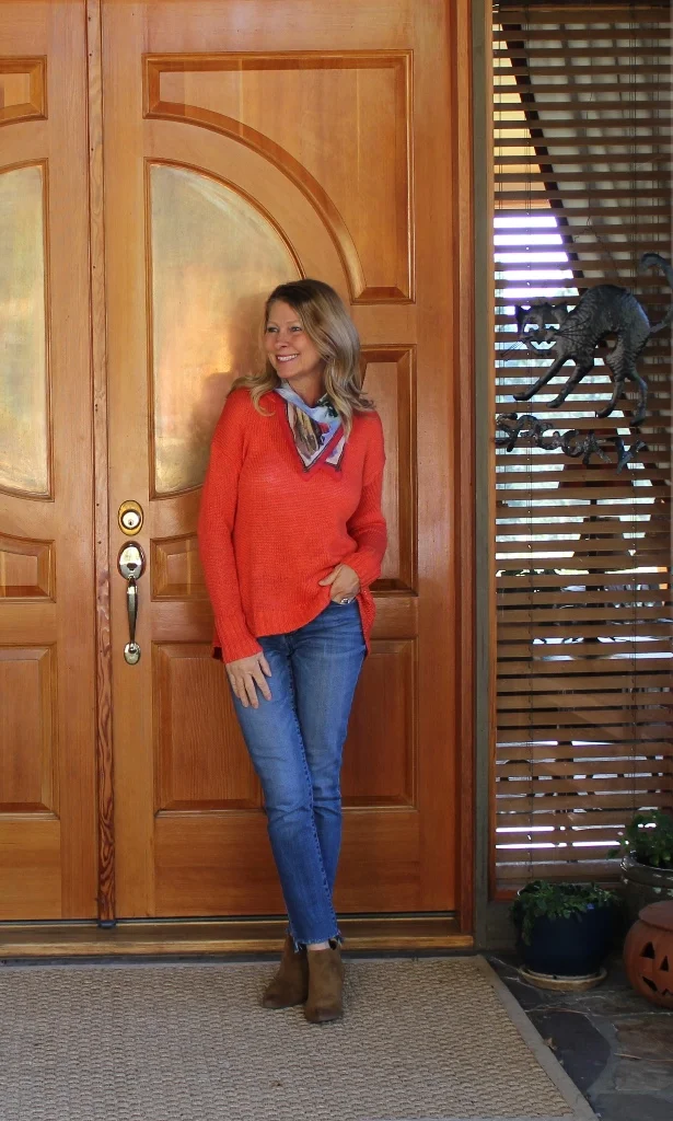 Usually I gravitate toward shoes with a heel. Not a really high heel but around three inches give or take. Every since booties came into style I have wanted to find a pair with a low heel for everyday wear but all the low heeled booties just didn't have a modern look to me. Until this season that is. I am now seeing really cute booties with a low heel. The next test was, how comfortable are they. This pair is close to like wearing slippers. I wore them for hours and forgot I had them on. And on the cuteness scale I rate them a perfect 10. I wore a pair of skinny jeans that I had cut the hem off for that raw edge look and a tried a couple different tops for fun.