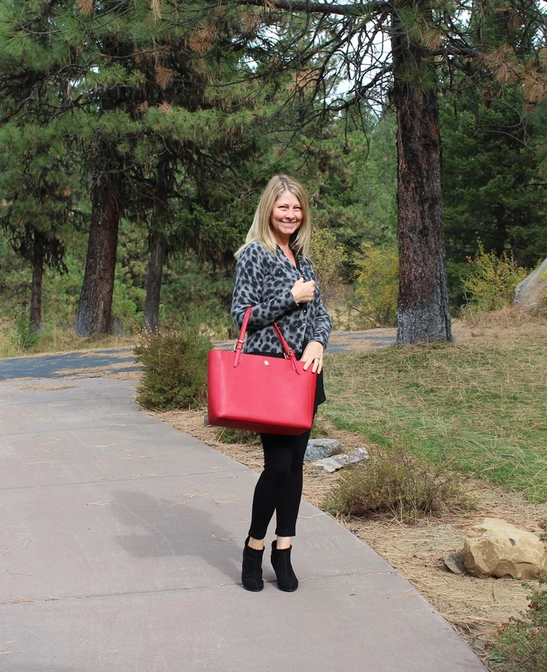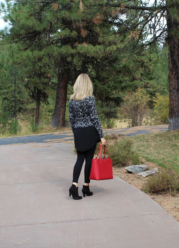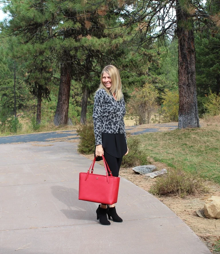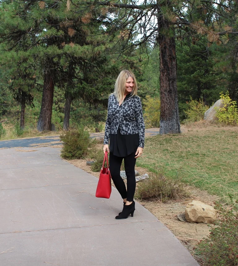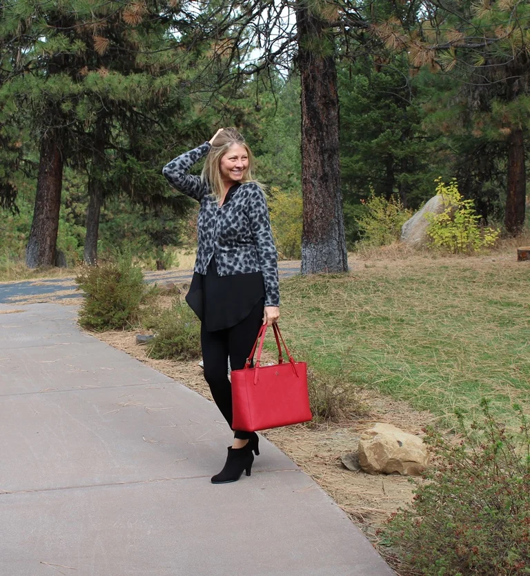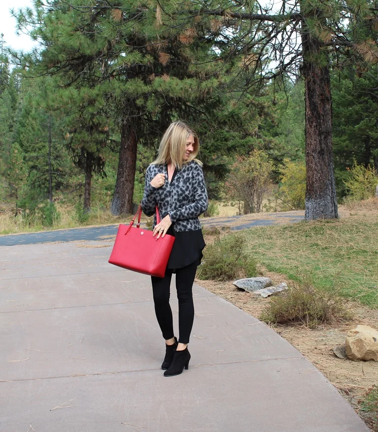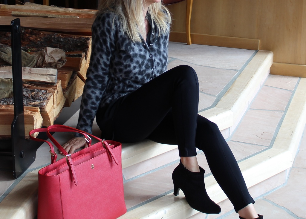Today was a cold and cloudy day but I was determined to live it like it was a warm and sunny day! I got up, went for my three mile run in 40 degree temperatures, came home made a healthy breakfast and then decided what to wear for the day. I like to think of my closet and clothes as my grown up way of playing dress up. Today, I wanted to put together something different, something out of the box for me, using things I have had for years. I decided on black leggings, low heeled suede booties, a black tunic with a leopard cardigan and red purse. All of the elements of this outfit were things I have had for a while but had never put together. I loved the outcome. First, I was completely comfortable. Second, I was out of my casual box of style for a change. I felt trendy and modern. This is an outfit anyone can copy with elements they probably have in their closet right now. All I can say is, Fun!