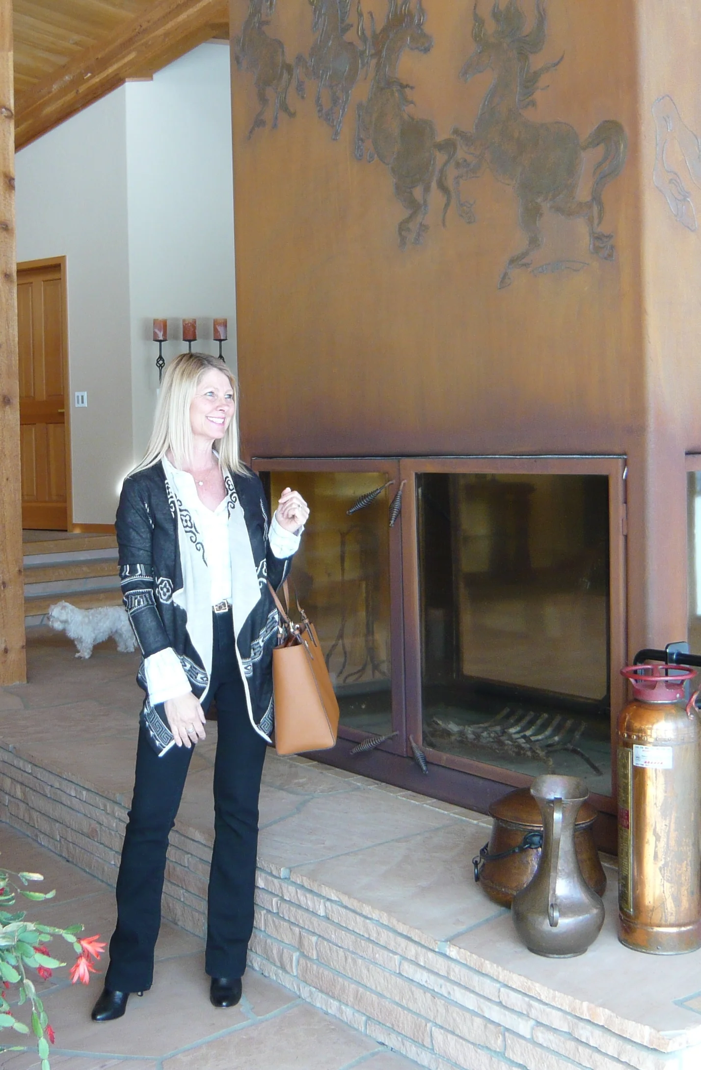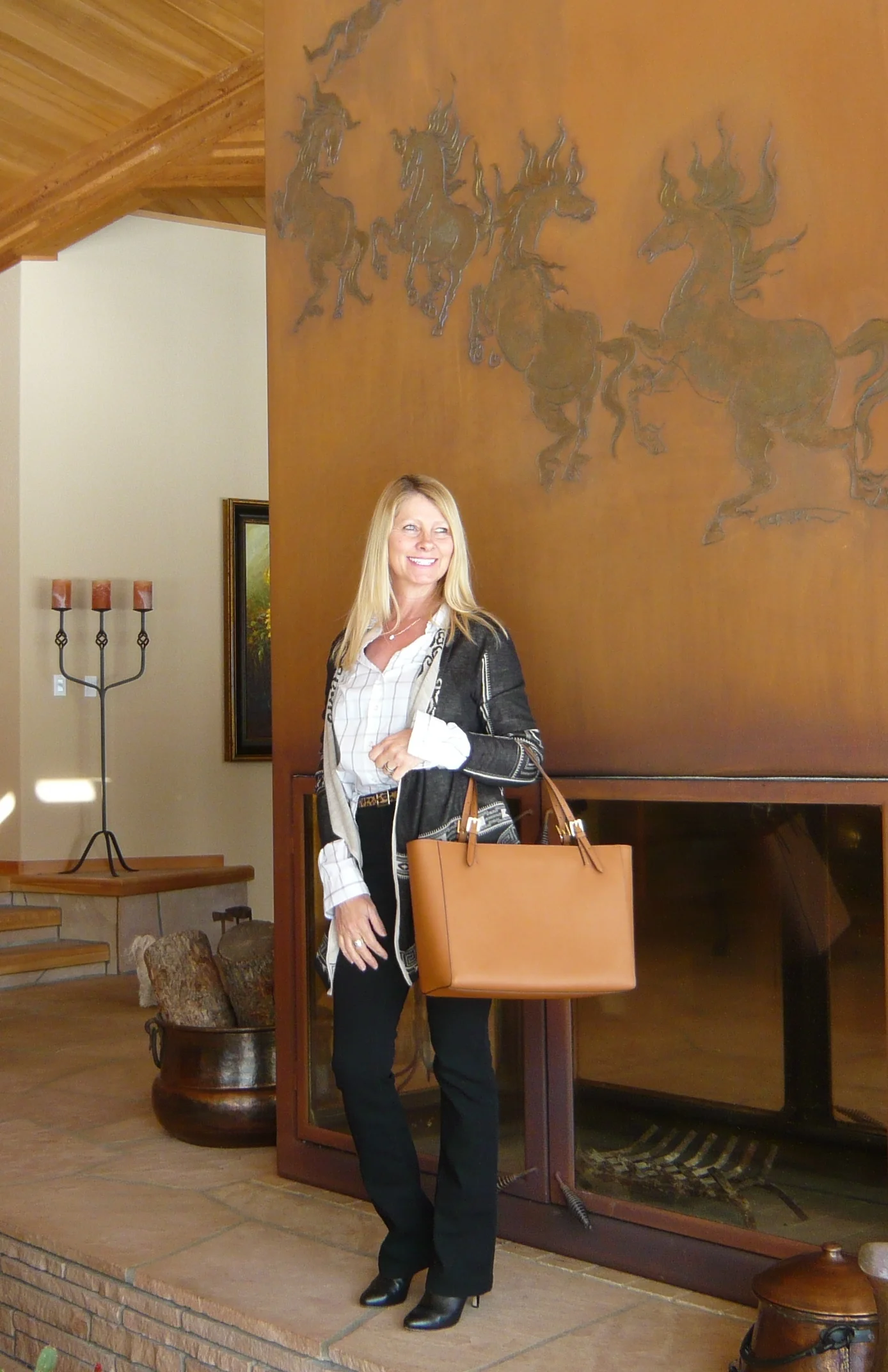 Pattern mixing is not that appealing to me but for some reason I find myself playing around with outfits that break an old rule. Many fashion rules are deeply ingrained in me from childhood. Living in a small rural town where people had strong beliefs, and even to a point, were judgmental, influenced me more than I realized until adulthood. My natural impulse is to follow rules and usually do what is expected but sometimes the rebel in me comes out, especially in fashion. It doesn't bother me at all to break old fashion rules anymore, I even embrace doing so. Pattern mixing is something that I don't wear well, and that is the reason, I am not all over it. But sometimes I can put an outfit together, that mixes patterns that I really like. This outfit is one of those. I am wearing a black and white window pane button up shirt, a black and tan southwestern graphic cardigan, black jeans and booties with a thin leopard belt. The contrasting tan bag took me from conservative to a little edgy. I grew up, in a time, when your bag should match your shoes. Now, mixing black and tan is probably one of my favorite fashion trends.