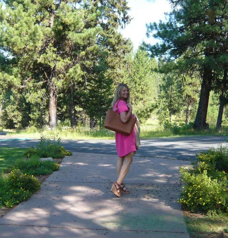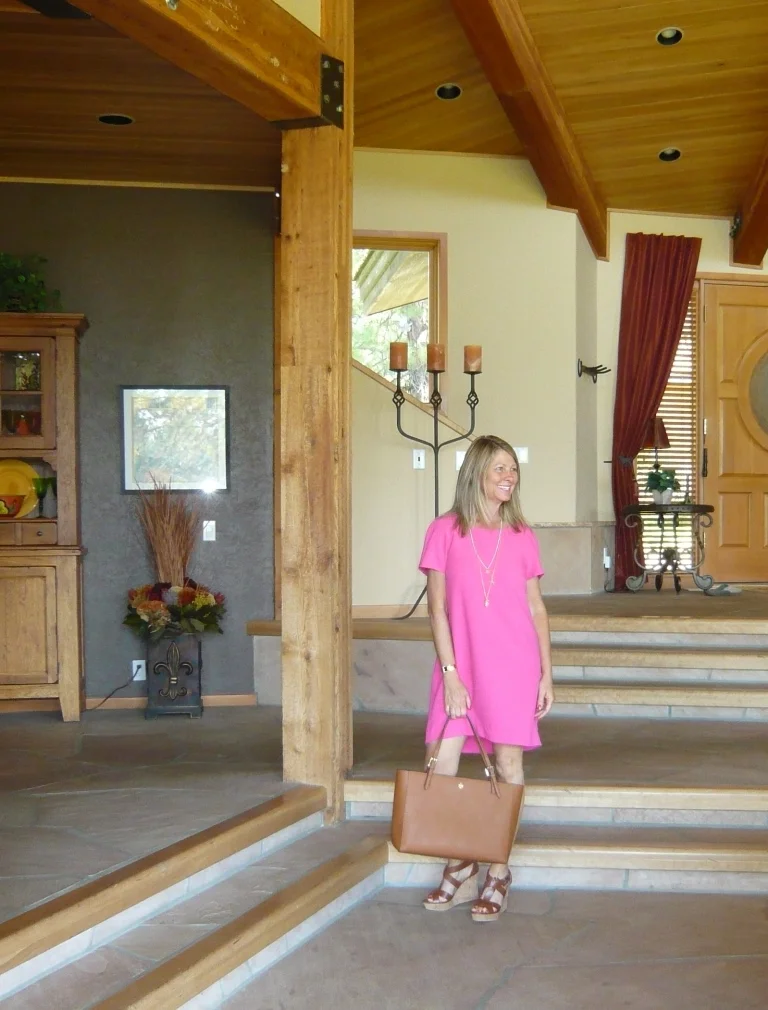 A vibrant pink color really says summer. Today I decided to look in my closet and find something I haven't worn for a while instead of my regular old jeans and t-shirts. I saw this bright shift and thought wow, why haven't I worn this more. I love the crepe fabric of this dress. It provides excellent coverage but is still light weight. It was still a little chilly in the morning so I added a tan cardigan. A tan bag and shoes were all I needed to complete the outfit. My shoes and bag have gold accents so I picked a gold necklace for jewelry. My pictures have been fuzzy lately because the sun is so bright and I am clueless on how to set the camera accordingly.
