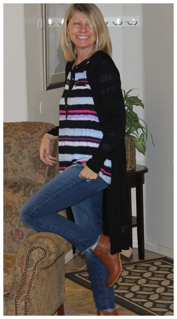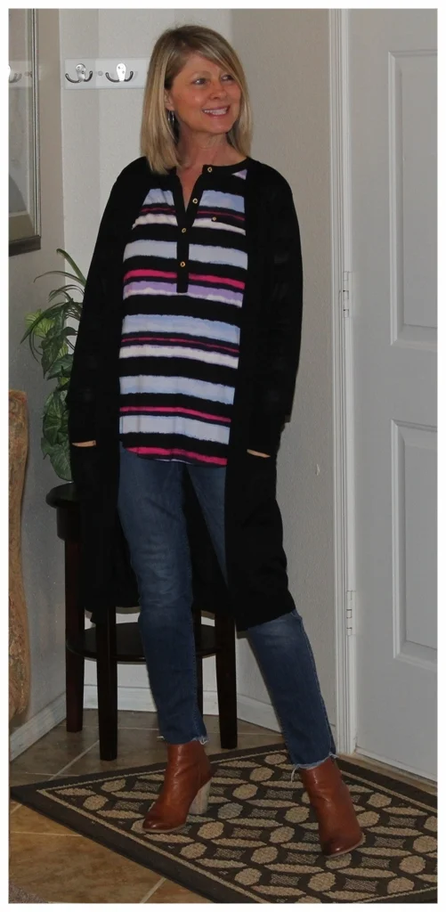 Here is an old rule in fashion that I think most people ignore anymore. I was always told not to wear horizontal stripes; it would make me look fat. But I see people wearing them all the time and they do not look fat. I found this top and loved the colors so much but hesitated a little because of the stripes. But when I found this lovely cardigan, I knew the two items would be perfect together. I felt I had discovered a little trick of the eye. The cardigan broke up the stripes giving me a slimmer look rather than pronouncing my mid section. Added to these jeans and booties, it made a lovely casual outfit of the day.