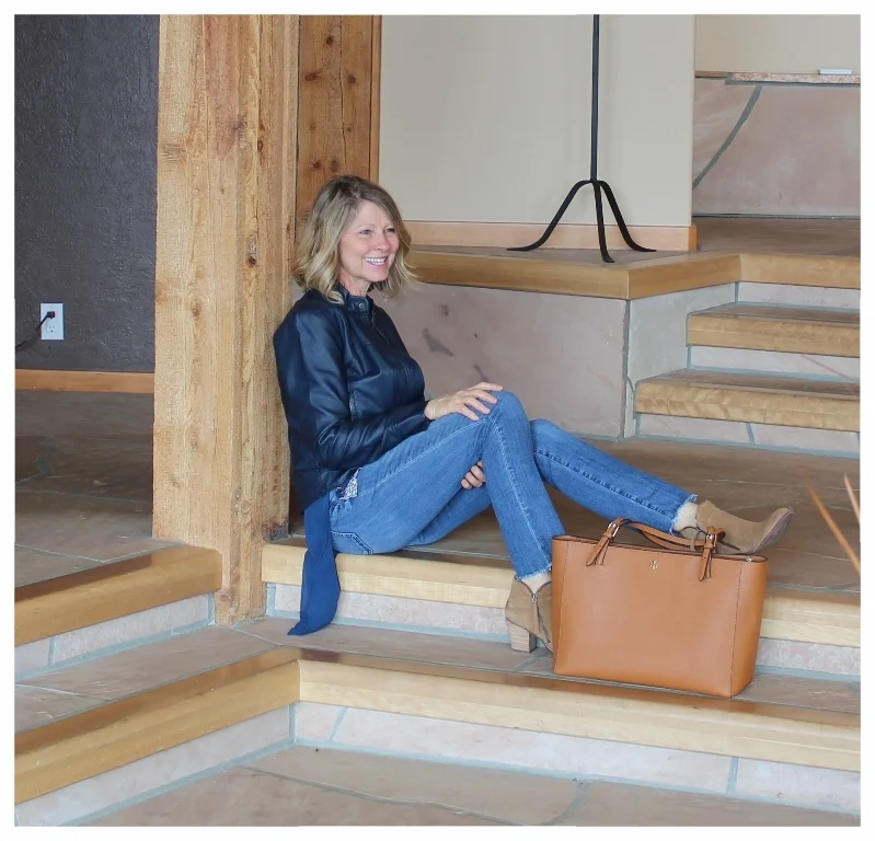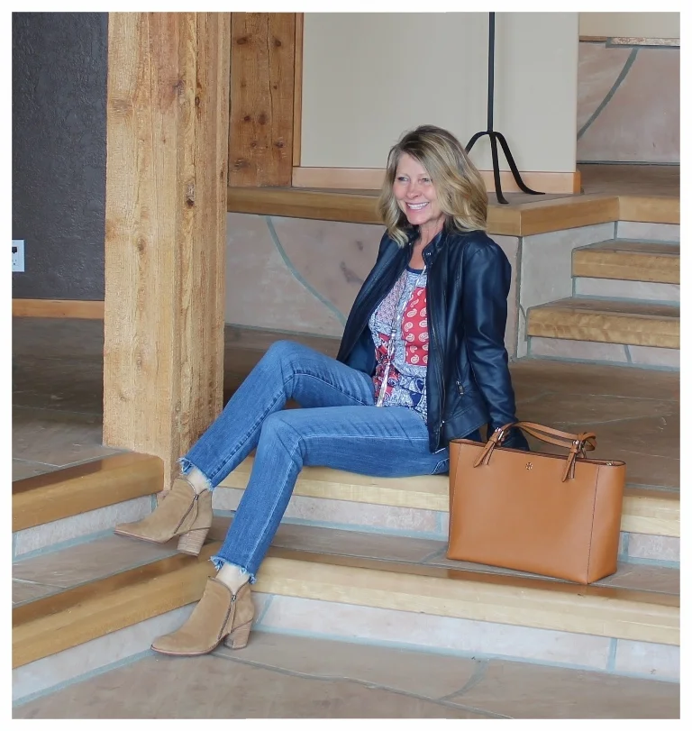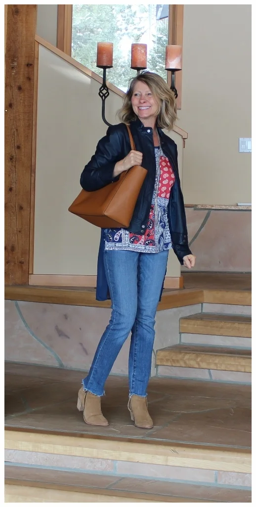I like a bargain so I shop at Marshalls a lot. Many times while I am looking at tops that are a great price, I think I would never wear that even though it is so cute. The top I have on was on clearance for $8 and I thought that. It is shear in the back and sleeveless and I will never wear it as is. But, I got to thinking about where I live and how I layer all year around and how this top would be a perfect layering top! I can wear it with jackets, sweaters or even under a denim shirt would be cute. For this picture I layered it under a faux leather jacket. See how it just pops and adds detail to my outfit. I love the knee length back of the top too. I added a pair of my DIY raw edge jeans, booties and neutral bag. For jewelry I wore my Chico's necklace that goes with about anything.