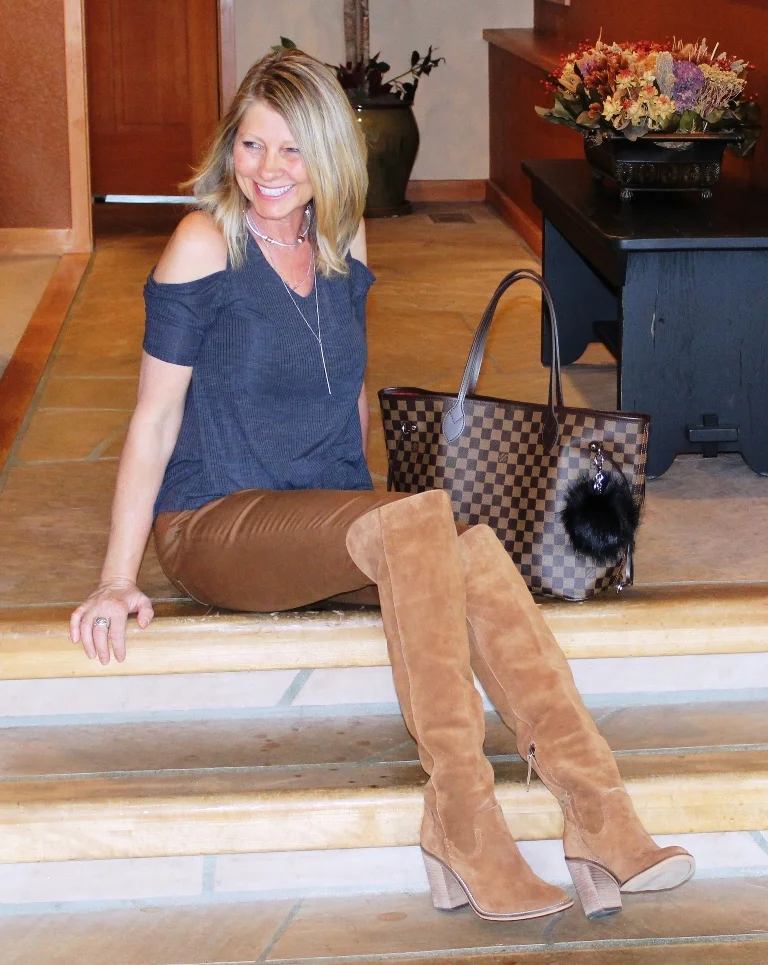A few of years ago when Over the Knee Boots starting popping up everywhere, I was sure I was too old to wear them. I let society whisper in my ear, no no, you can't wear those, you'll look like you're trying to be younger. But as with so many whispers in my ear, I ignored it and showed my husband a beautiful pair of Louise et Cie OTK boots that I loved and he got them for me for Christmas! I was so excited and the minute I put them on I loved them. The heck with what anyone thought! Over the next couple of years I added two more pairs. They are so versatile and absolutely a fun addition to my wardrobe!