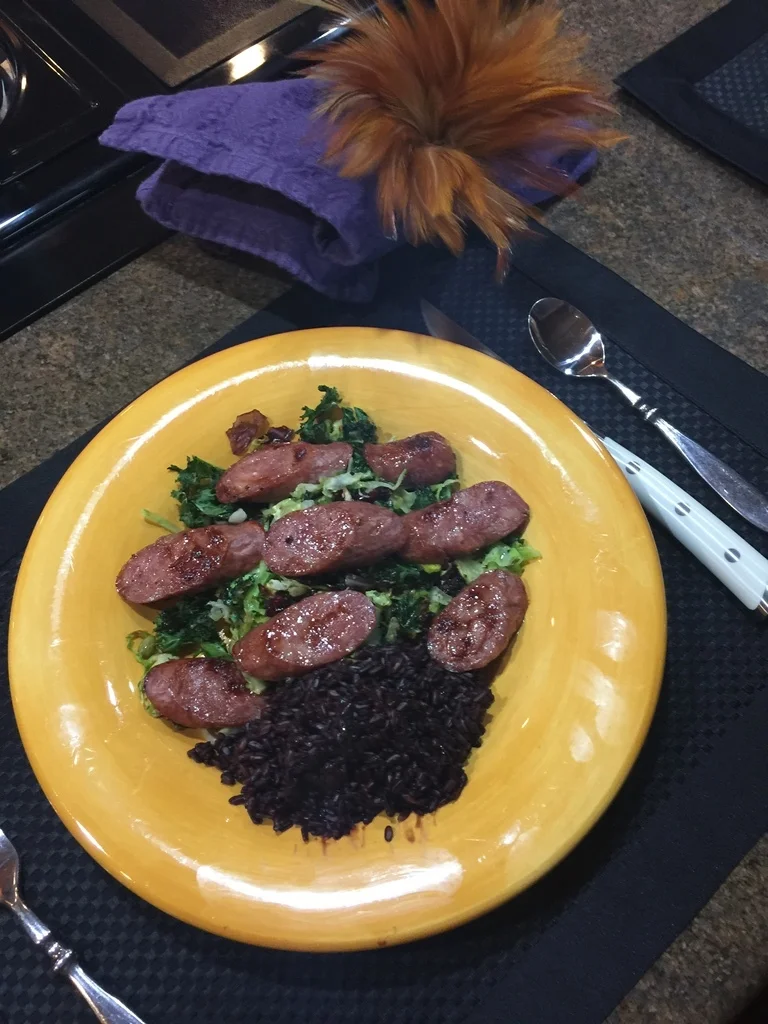 The Sweet Kale Salad Kit (made up of broccoli, Brussels sprouts, kale and several more things like that is something that I eat in one form or another at least three nights a week. I love them fresh as a salad and I love to roast them as in this meal. I also get these amazing chicken sausages at Costco but you can find both these items in most grocery stores. The sausage brand is Aidells. The sausages are organic and preservative free and they come in lots of flavors, like the one I am using (chicken and pineapple), chicken and apple, etc. As a fun side, another favorite of mine is black rice. It is such a pretty color on the plate and it has an amazing earthy flavor.