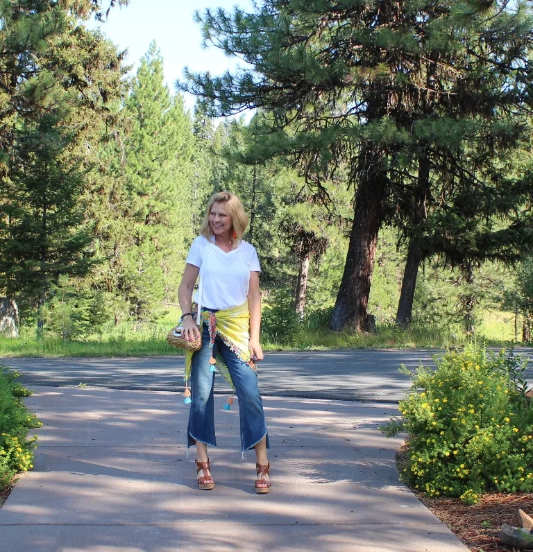 These pants are so different with the fun hem. I haven't worn them for almost a year and thought wearing them with a white tee might be fun. Then I added an old square scarf and an old pair of wedge sandals to complete my look. My orange tassel earrings and a wicker bag were great accessories.