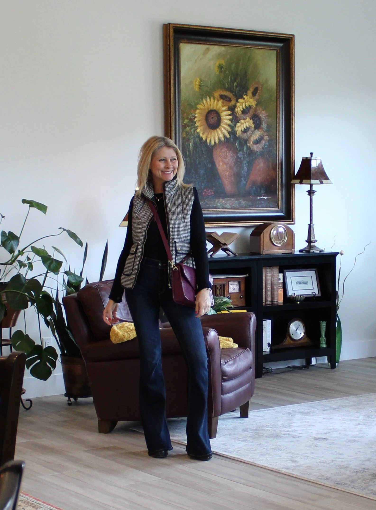 This look shows how buying classic pieces is a good investment since they stand the test of time. Vests never go out of style; the cut or length may change a little but they are a staple every fall. Flares might have been seen less during the skinny jeans years but they were still there and now they are having their hay day again. A simple black top can be styled in so many ways and a cross body bag is always on trend due to its functionality. And clogs are very popular right now. You can find them anywhere!