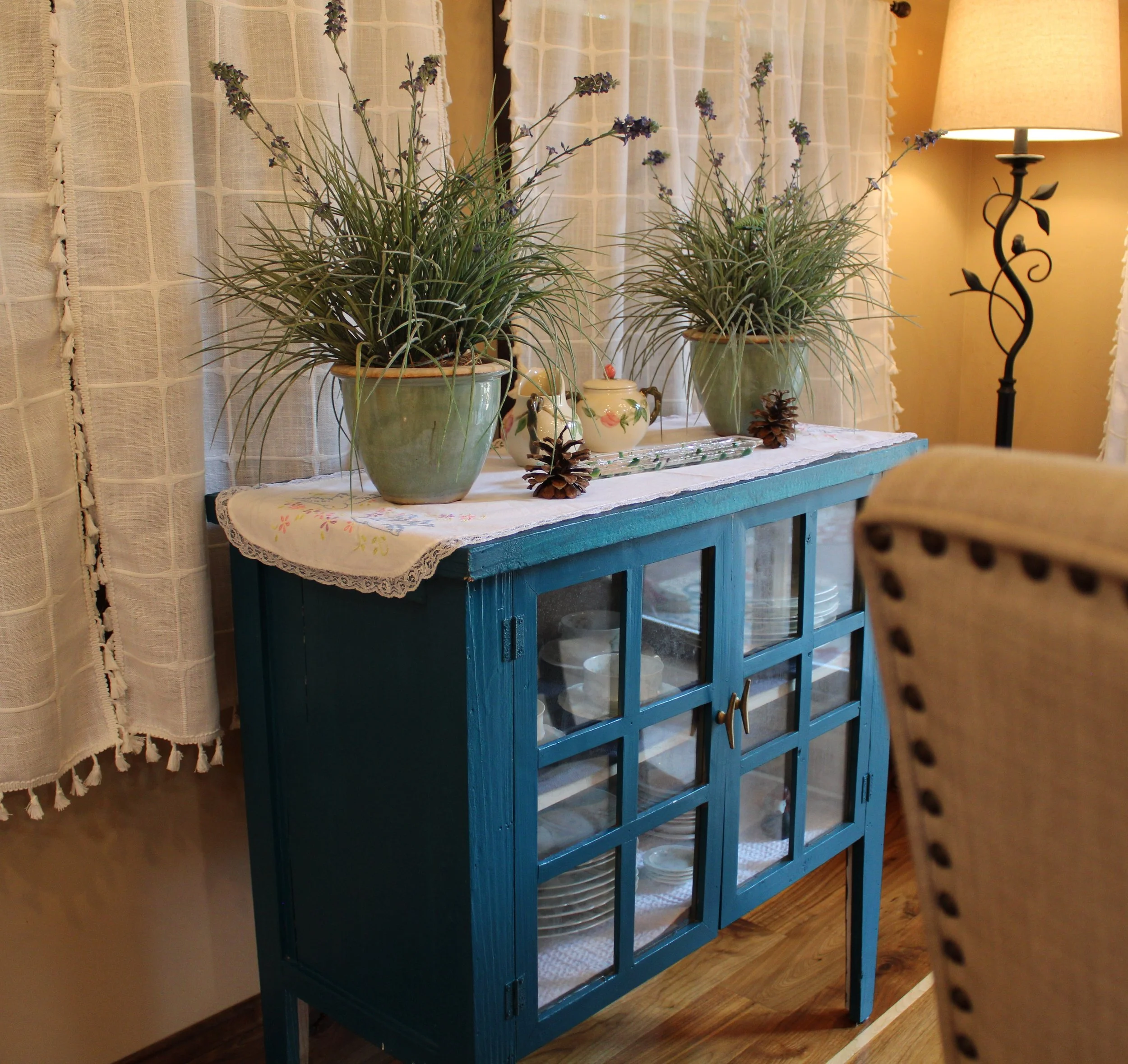The cafe curtains are new from Amazon and the faux lavender plants were thrifted. The cute hand painted olive dish was from a yard sale and the vintage creamer and sugar bowl was thrifted.