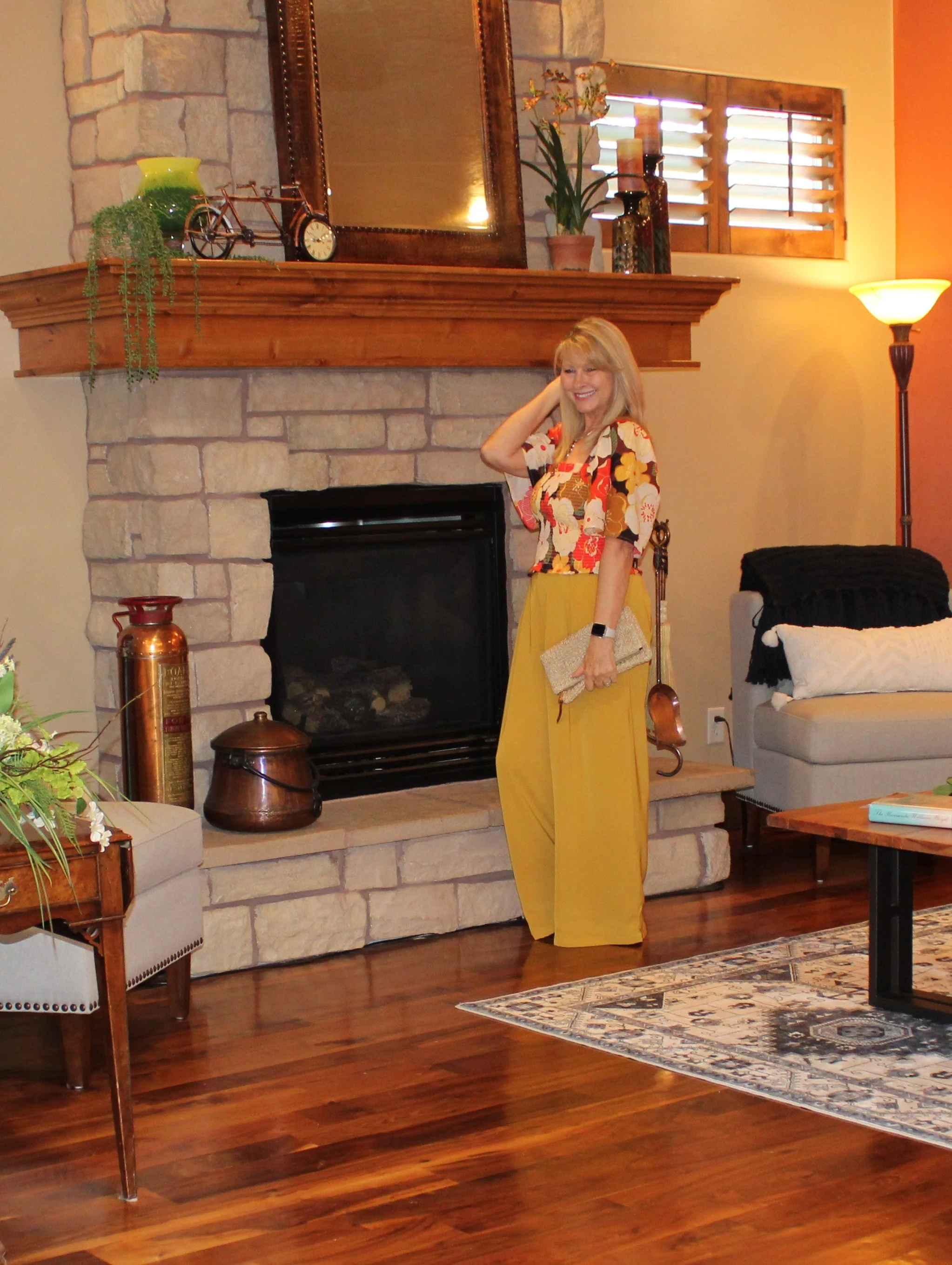 I am wearing a pair of wide leg pants in an almost gold color that are short enough for flat sandals. My top is such a pretty floral with big puffy bell sleeves and a smocked bodice. My necklace is three pieces of Amber stacked. It is an old necklace from Mexico that I adore. My bag is a simple straw clutch.