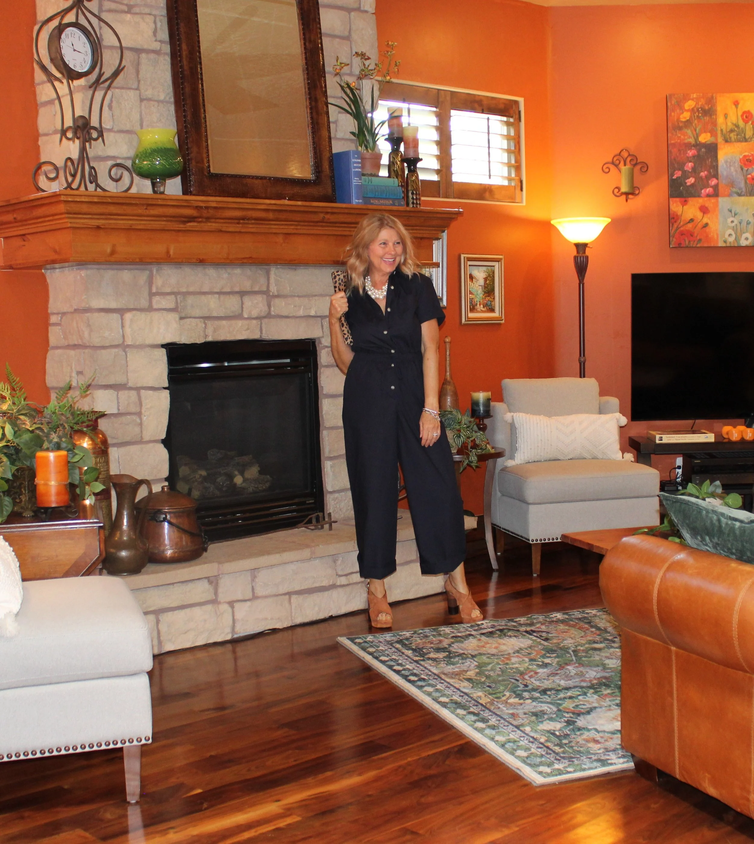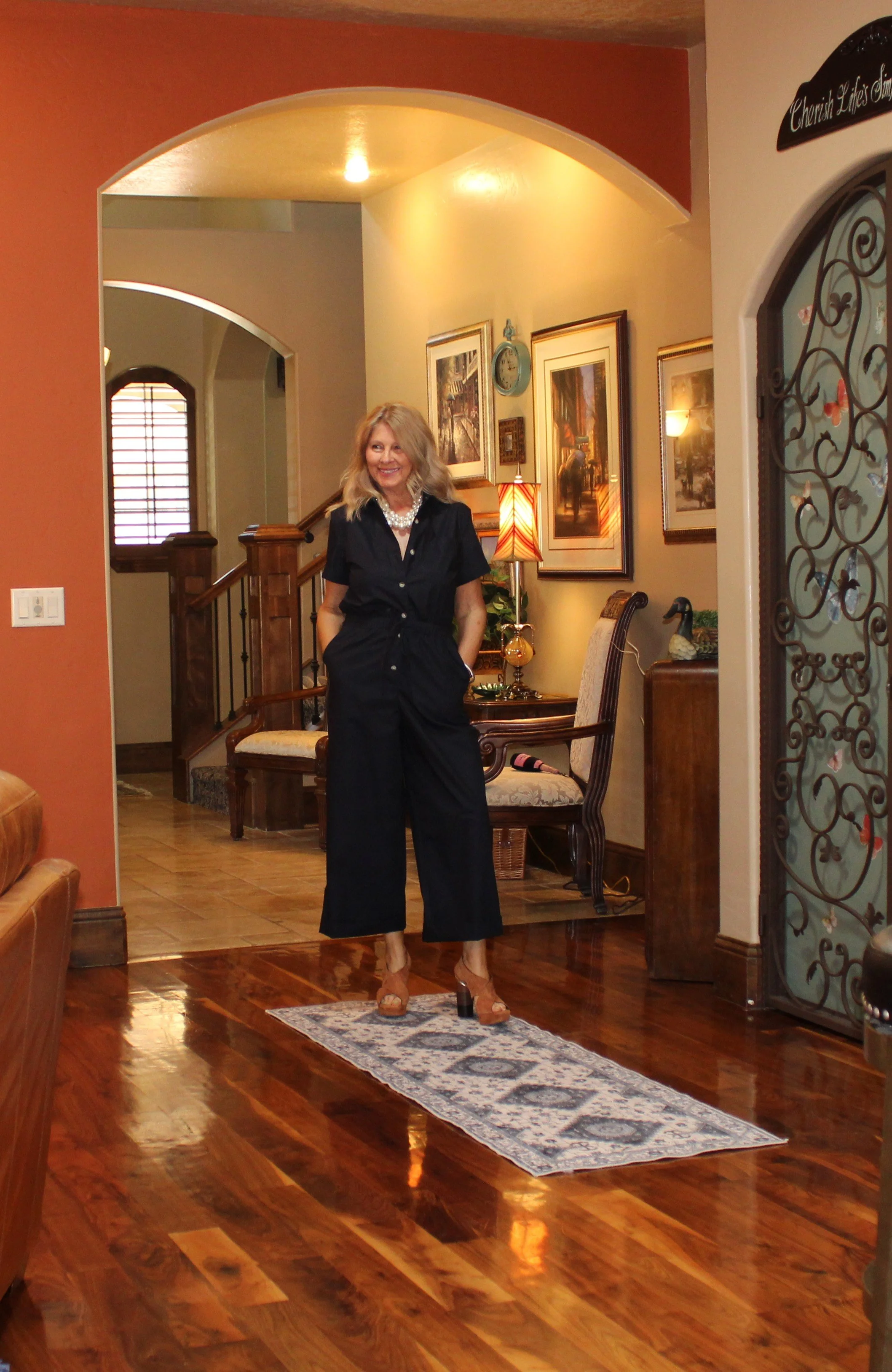 It’s been a few years since I started a love affair with jumpsuits. Each year another one finds its way into my closet. The is such cute one, light weight cotton for summer but a deep navy blue for elevated style. Of course, I had to wear my fabulous Ted Baker sandals and carry a Clare V. clutch. Both several years old but classics. My necklace too, is many years old bought from J. Crew. I love the go big or go home pearls.