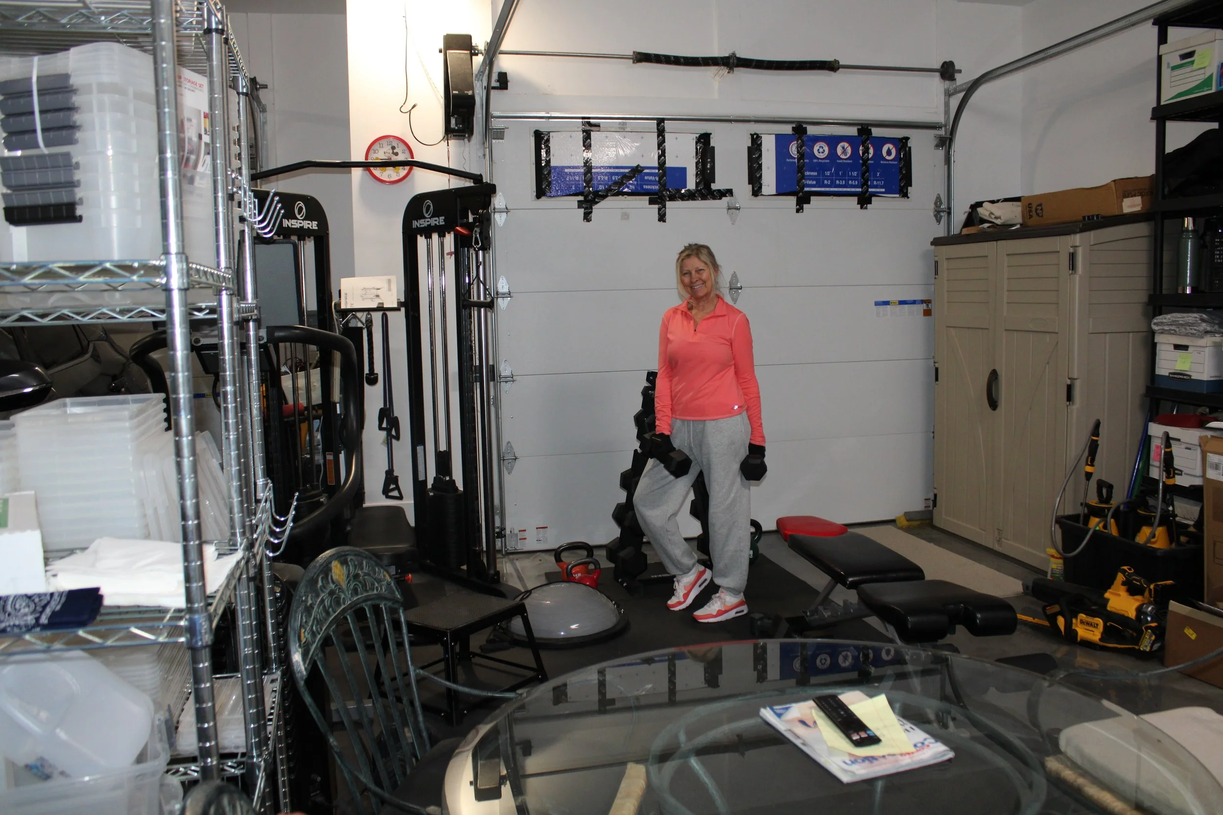 Welcome to my home gym! Ha! We carved out a little space to put our equipment a few years ago in the garage and I use the space a lot! Here in Arizona in the winter, I open the garage door to the sun and do my workout. It is pure pleasure.