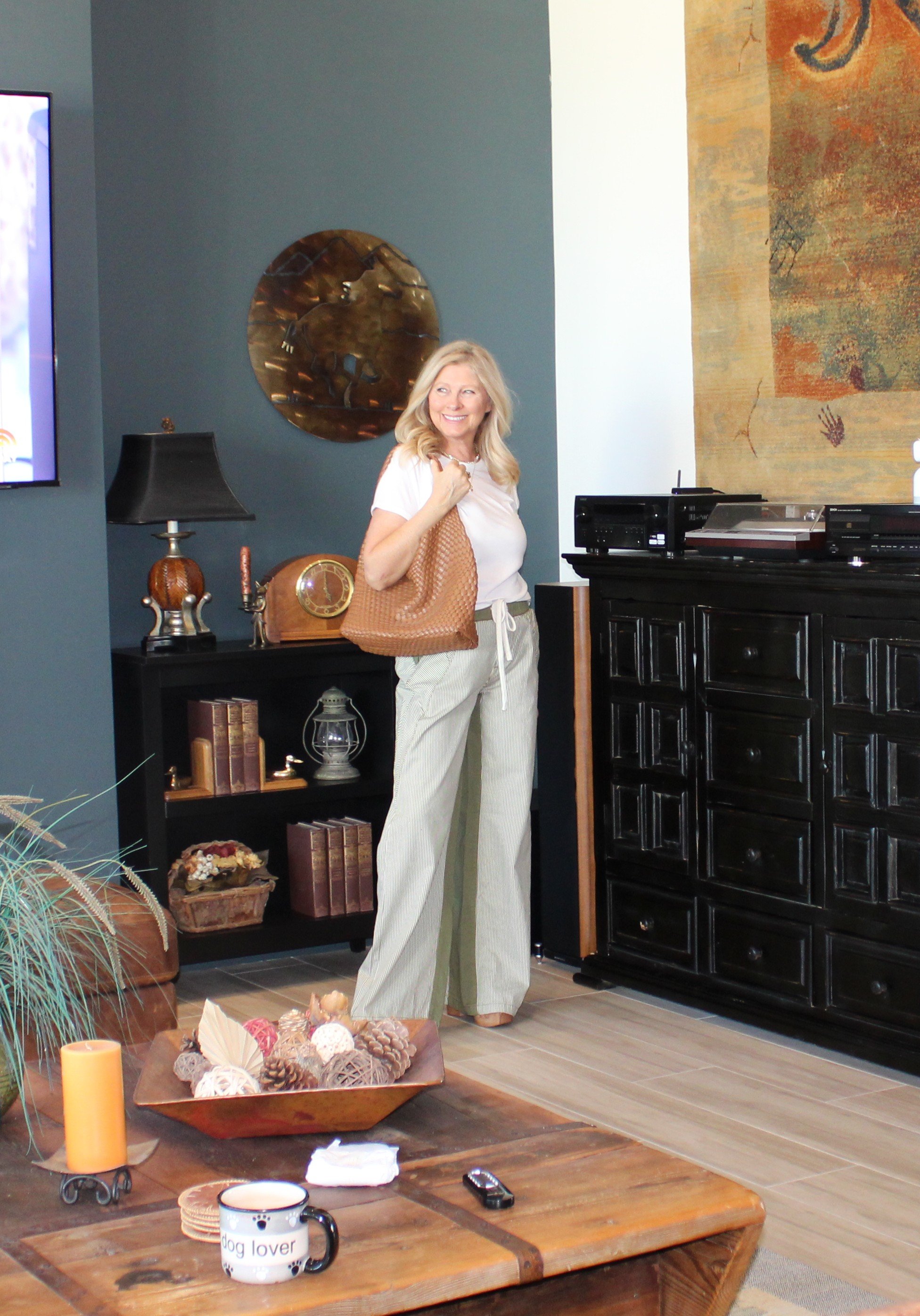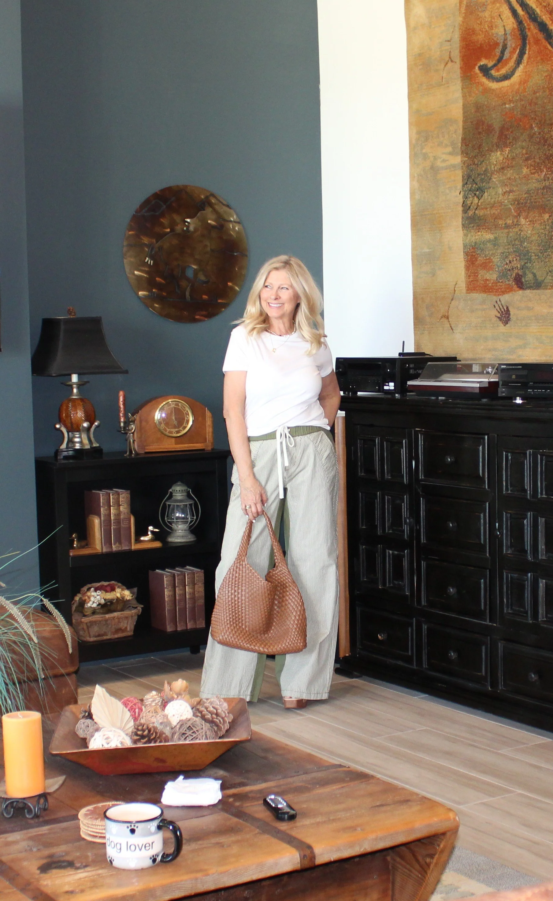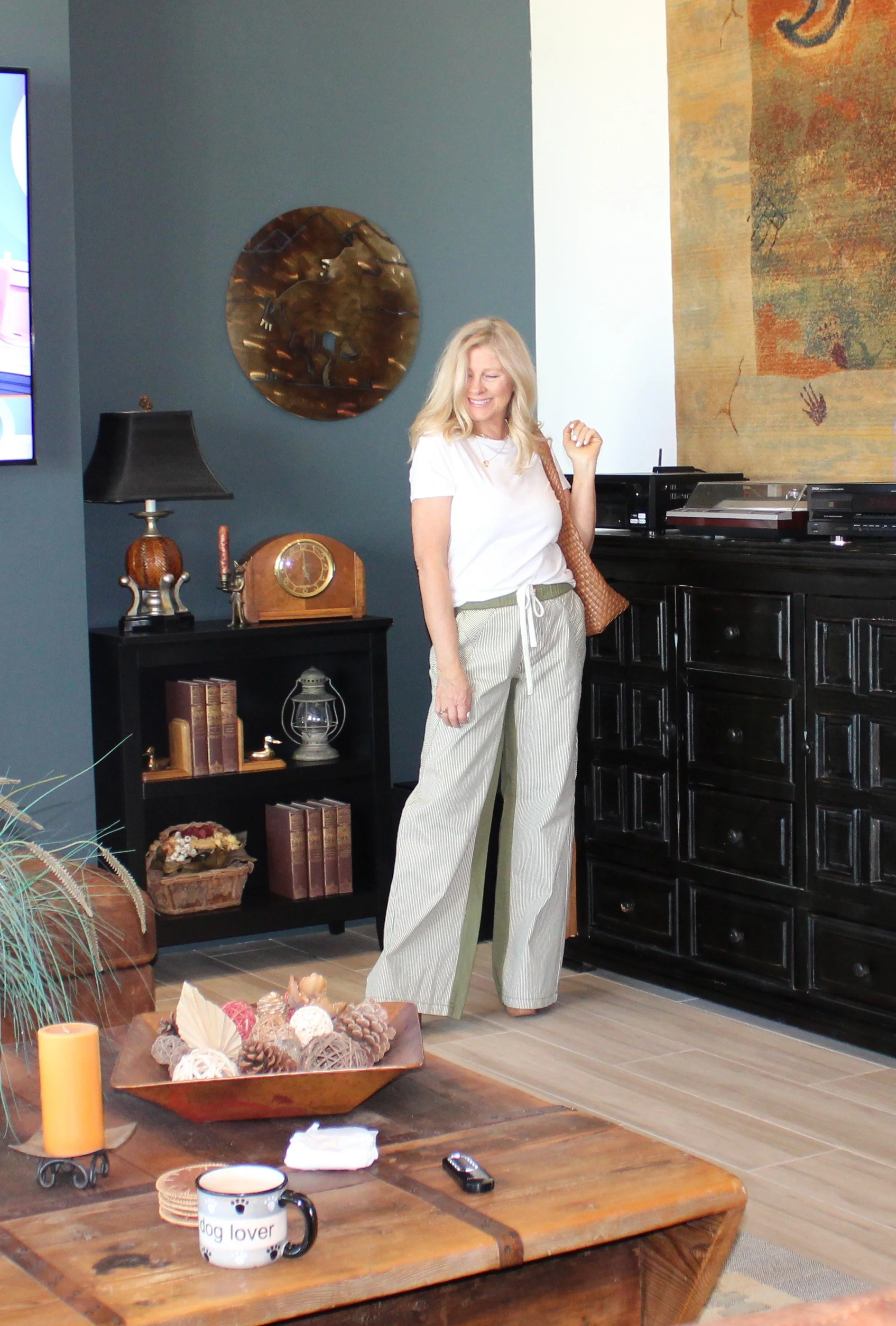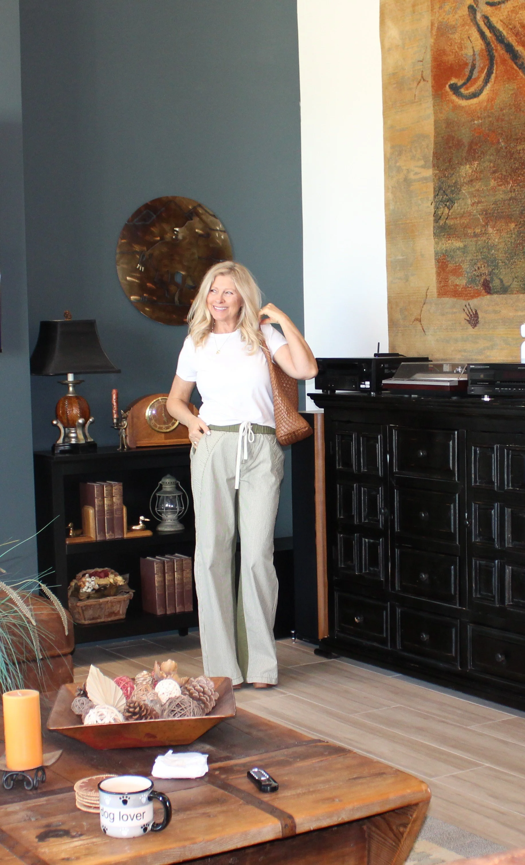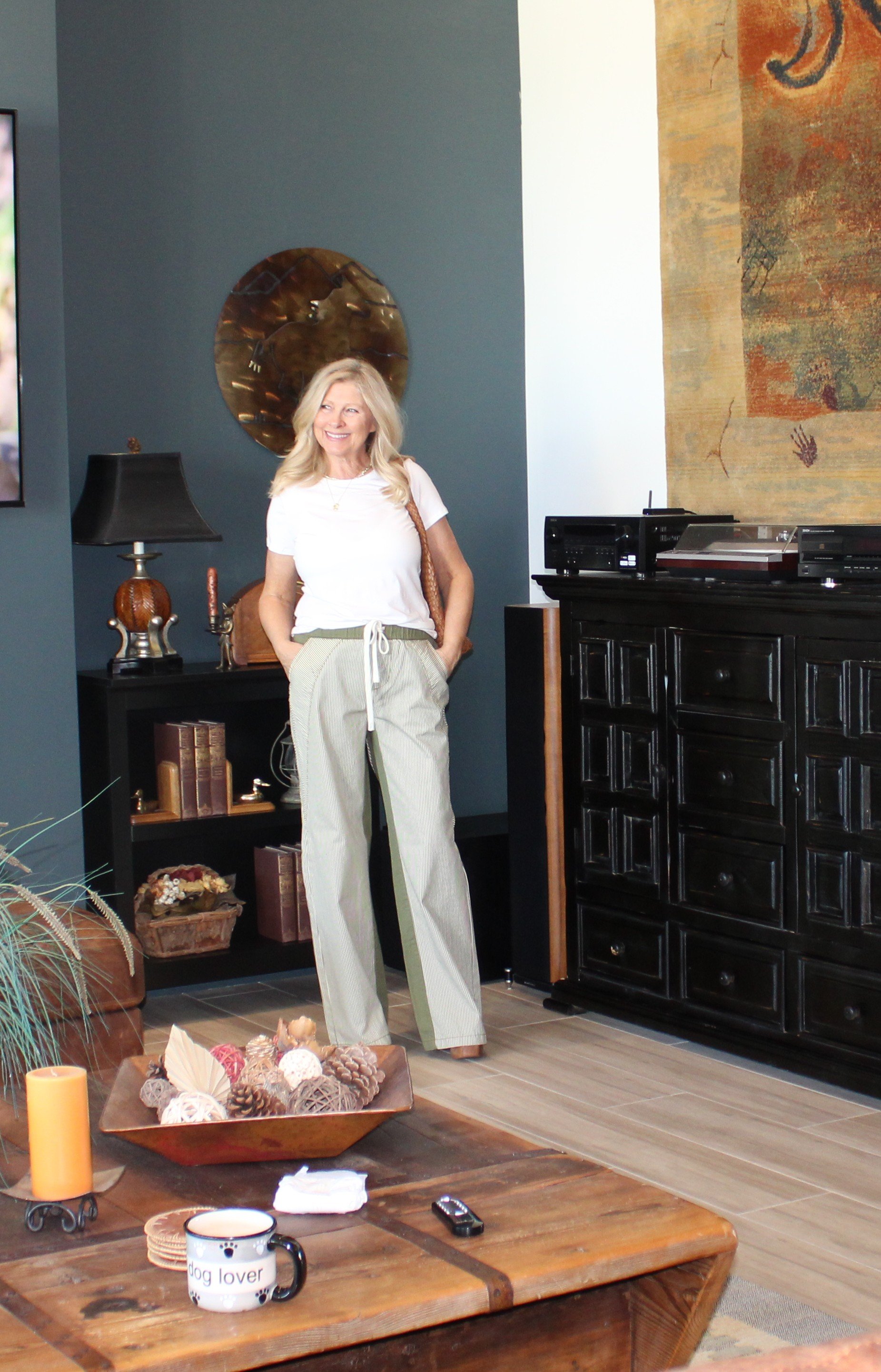 These pants have been hanging in my closet all winter and I was loving their vibe for spring. They are a nice weight fabric so good for all the seasons but the sage green pinstripe just spoke spring to me. I wore a crisp white tee and wood heeled sandals completed my look. I carried a tan woven tote.